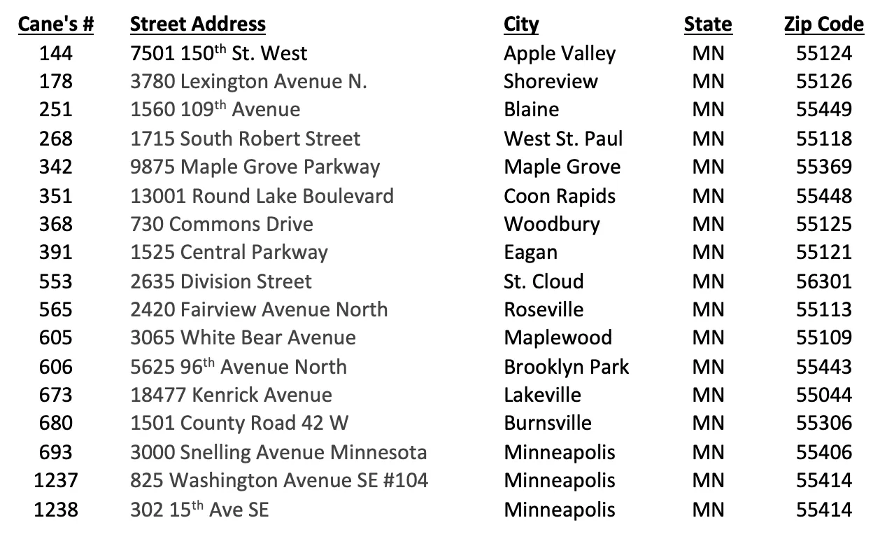 13. Winners’ List: For a list of major (ARV $25 or more) Prize winners, mail a self-addressed stamped envelope to Raising Cane’s 2026 Minnesota 100 Chicken Finger Tailgate Winner’s List, Attn: Mike Fuller, 6800 Bishop Road, Plano, TX 75024, for receipt no later than 30 days following the end of a Promotion.